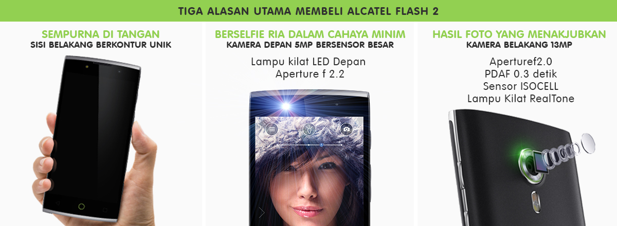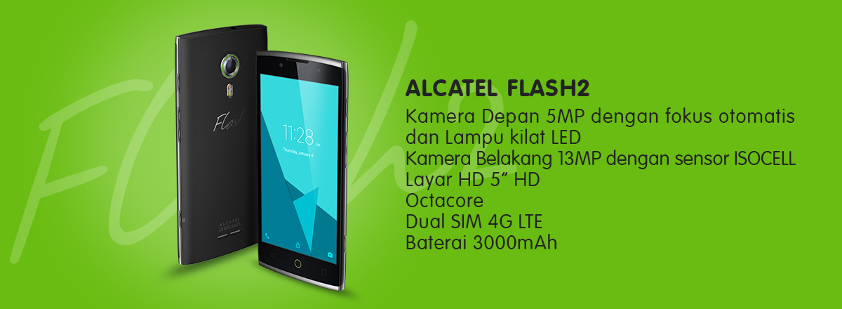 Pemimpin ponsel ternama merek Alcatel OneTouch telah datang dengan kabar baik bagi para pecinta selfie dengan peluncuran ponsel Alcatel OneTouch Flash 2 . Desainnya yang mewah dengan layar yang besar 5" HD IPS LCD capacitive touchscreen, 16M colors. Alcatel OneTouch Flash 2 ini juga dilengkapi dengan kamera utama 13MP dan kamera depan 5MP yang cocok bagi anda yang suka untuk berfoto selfie. Baterai sebesar 3000mAh yang tahan lama juga menjadikan ponsel ini menjadi pilihan yang tepat bagi Anda.
